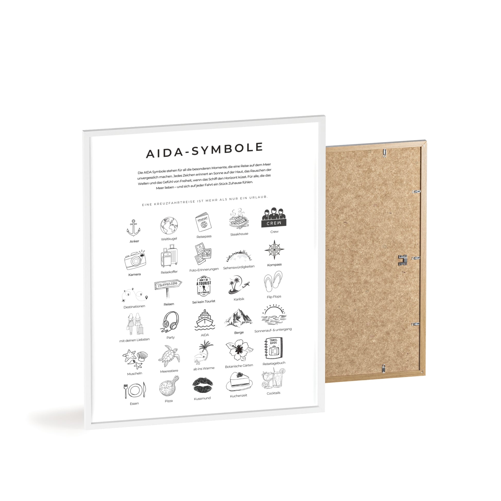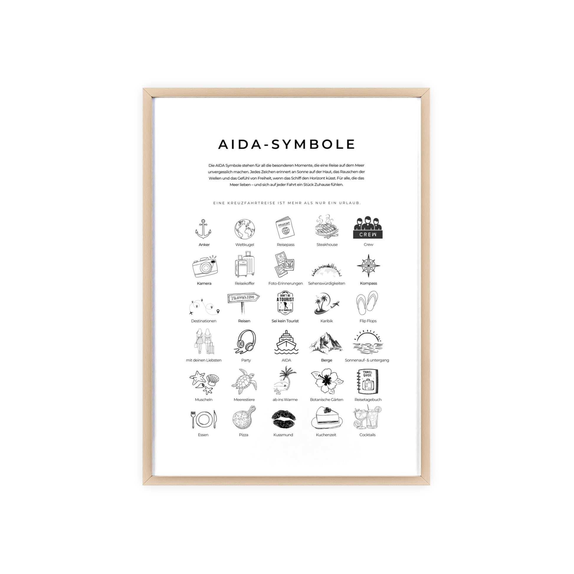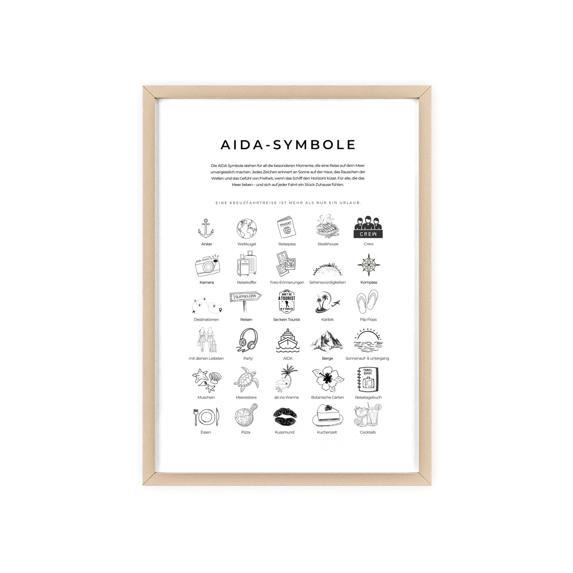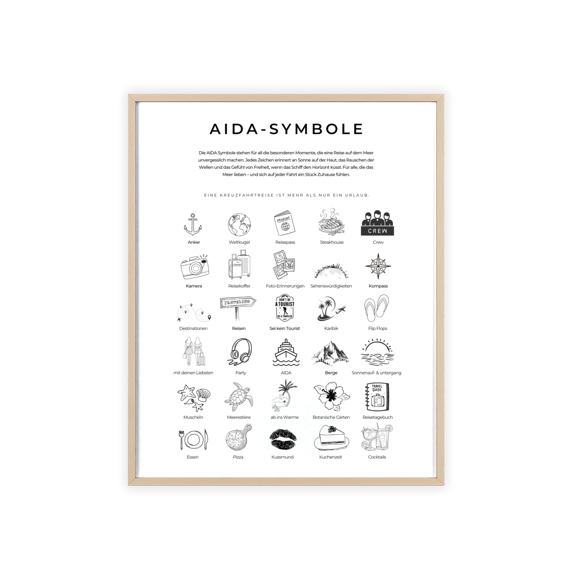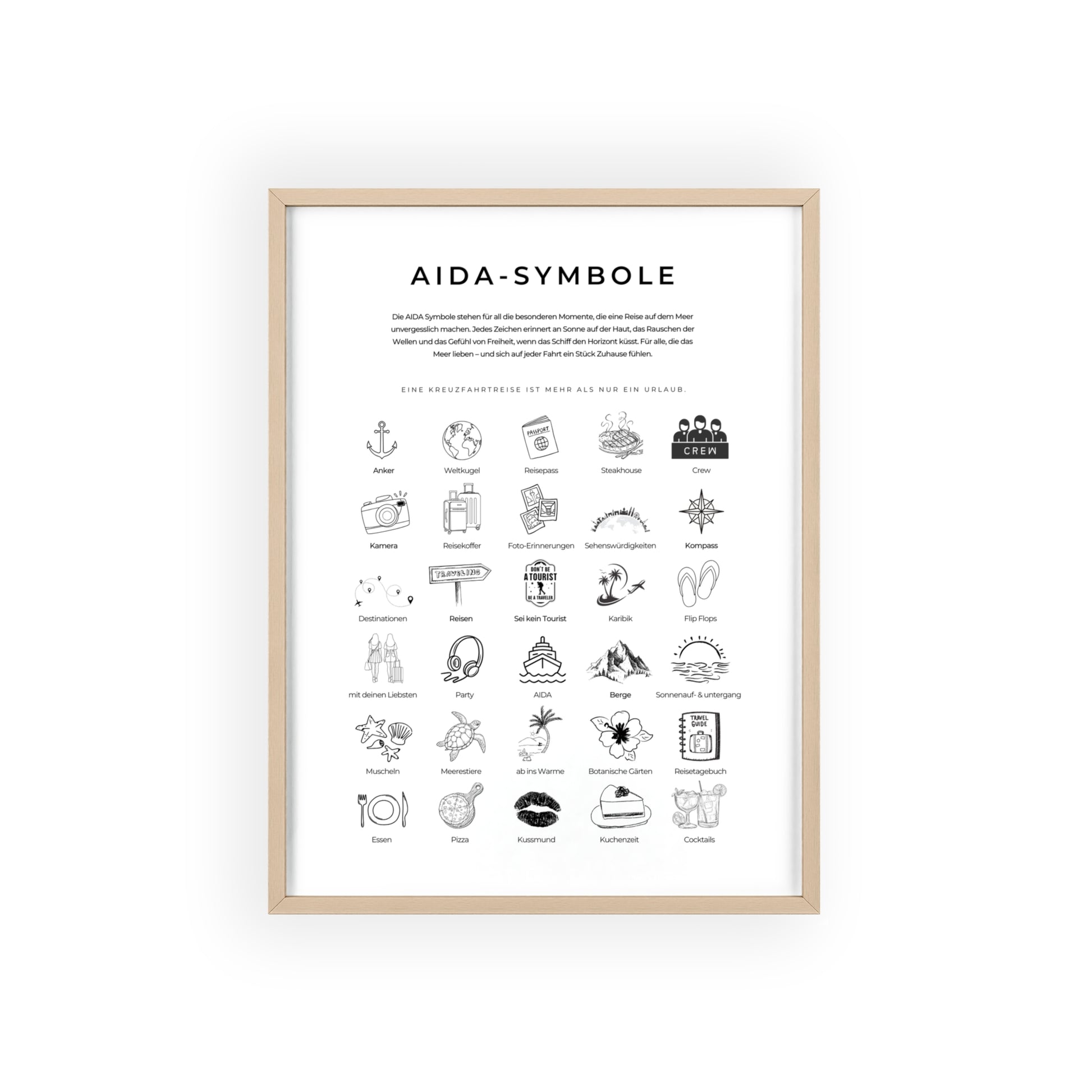 Wandposter mit Holzrahmen - AIDA und Reisesymbole